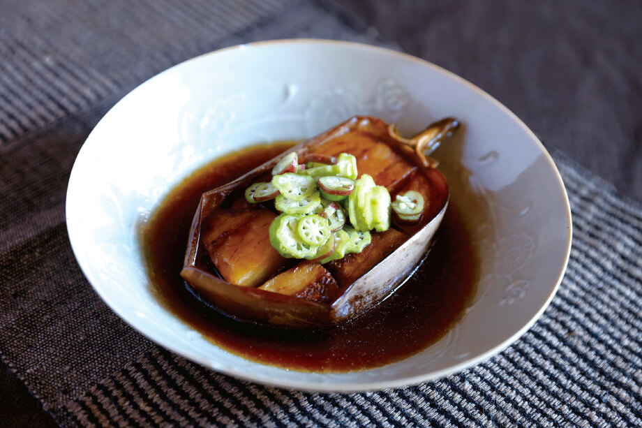 4.鍋に1のしょうゆダレを入れて、3の揚げたなすを入れて5分ほど弱火で煮込む。火を消したら粗熱が冷めるぐらいまで置く。器に盛って、オクラをトッピングする。