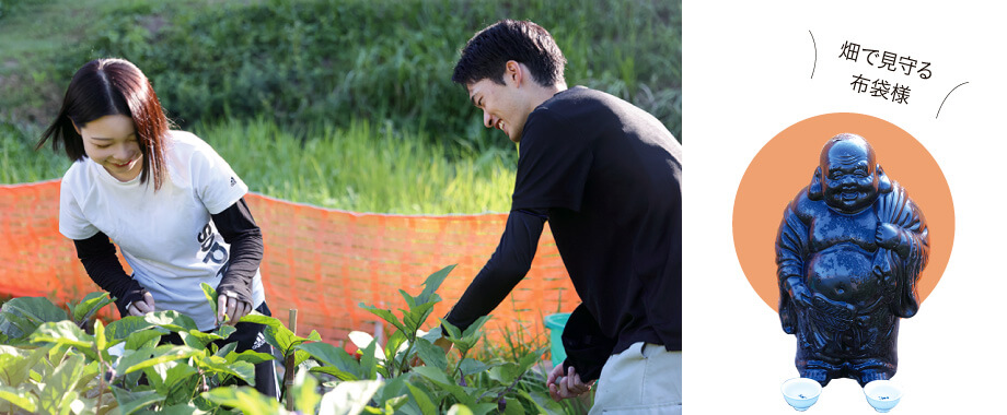 そのバトンを受け取ったのが波渡なすの新保存会だ。会長を務める熊谷智さんと保育園の職員だった熊谷真希子さん、山大農学部の学生である佐藤直稀さん、齋藤睦美さんにも話を聞くことに。保育園の閉園を受け、貴重な波渡なすの種をどうつないでいくか──。地域の活性化事業に取り組む智さんらに話が持ちかけられたことをきっかけに、その後のタイミングで智さんが鶴岡の魅力発見をテーマにした学生向けのイベントに参加。在来作物を研究していた直稀さんと運命的な出会いがあって意気投合。一緒に栽培を手がけていくことになった。