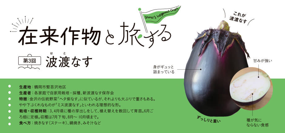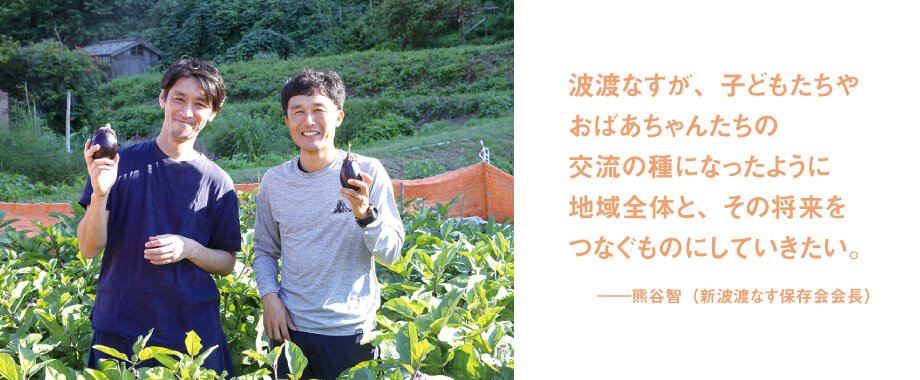 艶やかで美しく、大ぶりな波渡なすは、肉厚でうまみも強い。専業の農家もいないのに自家用として続いてきたのは、やっぱりおいしいからに違いない。波渡なすの新保存会の新章が、これからどんな新しいストーリーを紡いでいくのか、楽しみで仕方がない。