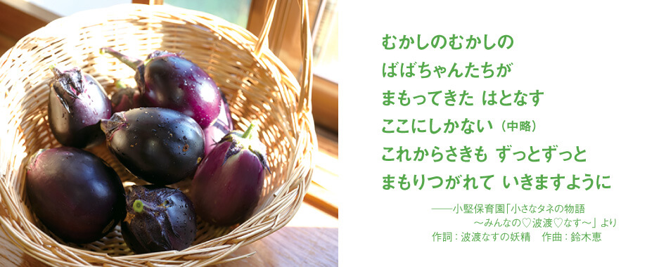 海と山に近い小堅保育園は体験活動に力を入れていて、その一環としてのなすづくり。育て方を教えるのは、ばばちゃんたち。昔は和装だったことから、種の芽出しは、着物の懐で人肌に温めていたなんてエピソードもあって。園児たちも種を手縫いのポシェットに入れて、肌着の中へ。波渡なすの歌もできて在来作物をテーマにしたミュージカルにも出演、園児たちはみんなで歌いながら、自分の子どものように種を温めたんだそう。