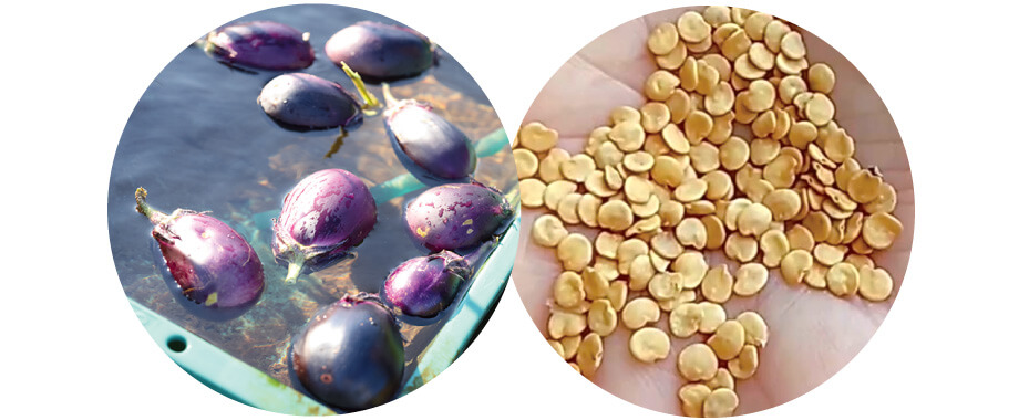 採種は、種に傷をつけないように包丁を入れず、地面に落として割り、水の中に入れて種を取り出すそう。