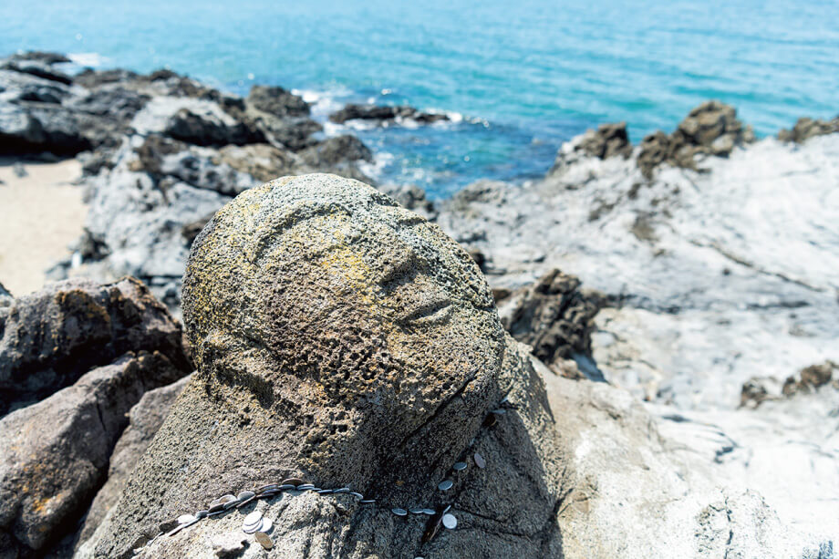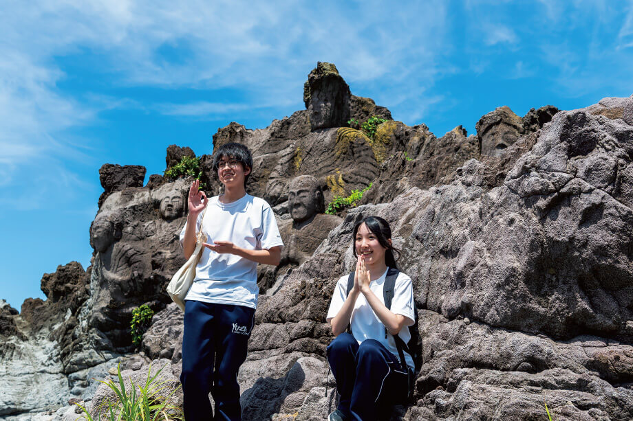 鳥海山麓の海沿いの観光スポットの1つ、十六羅漢岩。16の僧侶と、釈迦牟尼(しゃかむに)、文殊菩薩(もんじゅぼさつ)、普賢菩薩(ふげんぼさつ)、観音、舎利仏、目蓮の22体の石仏は、江戸から明治にかけ当地の海禅寺21代寛海和尚が、漁師などの海上安全祈願、海難事故で亡くなった人たちの供養のため、地元の石工たちを指揮し5年以上かけて彫り上げたものだといわれています。この彫られた岩も、鳥海山の噴火により流出した溶岩なんです。「流出した溶岩で海岸が突き出た形になったため、海難事故にあった船や人が流れ着くことが多かったのではないか」と大野さんは推測します。