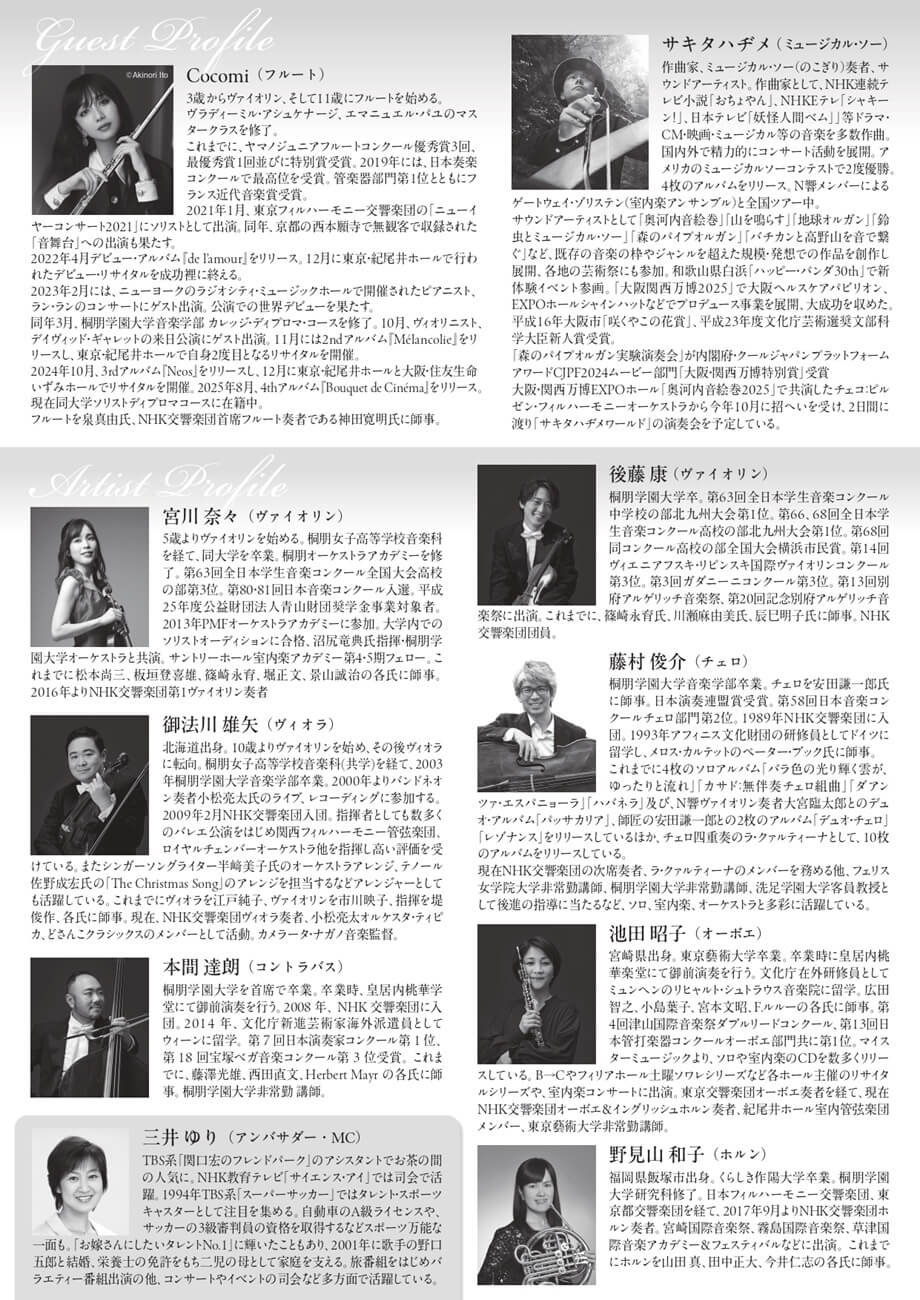 特別ゲストは歌手で俳優の木村拓哉さんと歌手の工藤静香さんの長女であるフルート奏者Cocomiさんと、NHK 朝の連続テレビ小説をはじめとした様々な音楽を担当し、作曲家としても活躍しているミュージカルソー奏者のサキタハヂメさん。クラシックの名曲の数々やNHK連続テレビ小説の主題歌など、バラエティ豊かにお届けします。