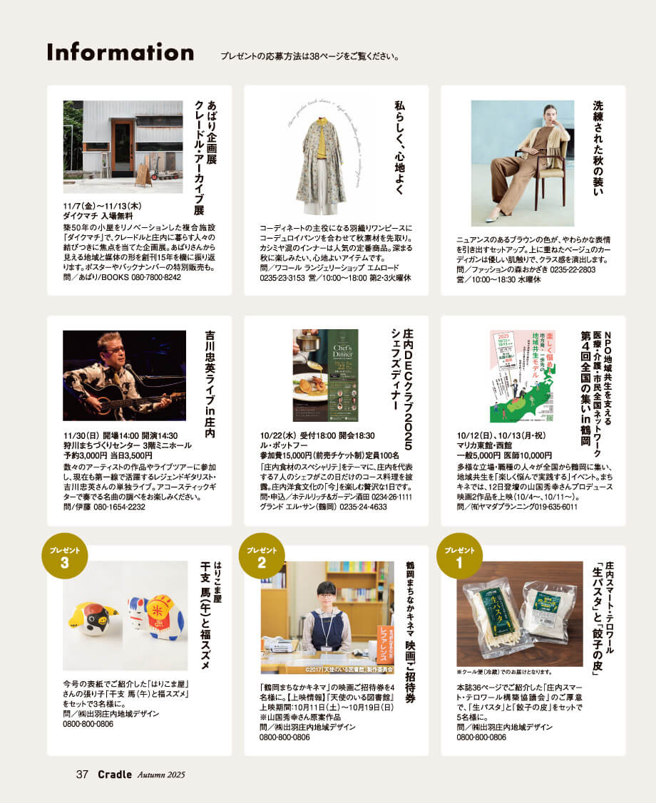 HOME記事一覧イベント・お知らせ【2025年秋号掲載イベント情報】Information 記事一覧 イベント・お知らせ 【2025年秋号掲載イベント情報】Information 2025/09/24 庄内町 ⁄ 酒田市 ⁄ 鶴岡市 ⁄ クレードル この記事を書いた人 Cradle編集部Cradle Editors 庄内の魅力を発信する、出羽庄内地域文化情報誌「Cradle(クレードル)」を隔月で発行。庄内に暮らし、庄内を愛してやまないメンバーたちの編集チームです。