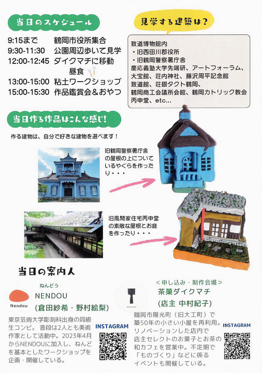 【場所】鶴岡市役所駐車場(集合) → 鶴岡公園周辺(徒歩で建物見学) → 茶菓ダイクマチ(粘土ワークショップ)